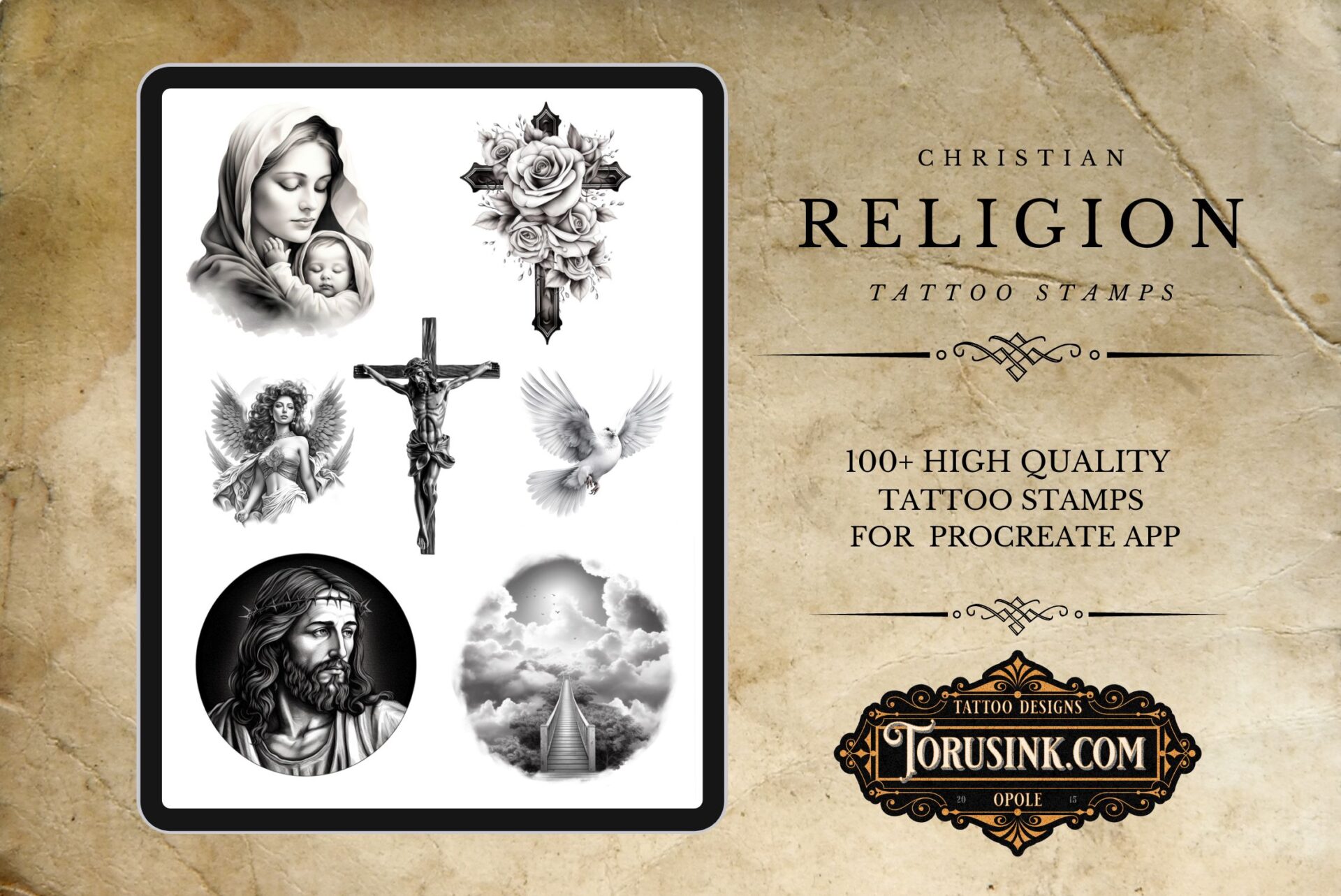 100 + Religion, Procreate Brush Set, Unique Tattoo Stamps