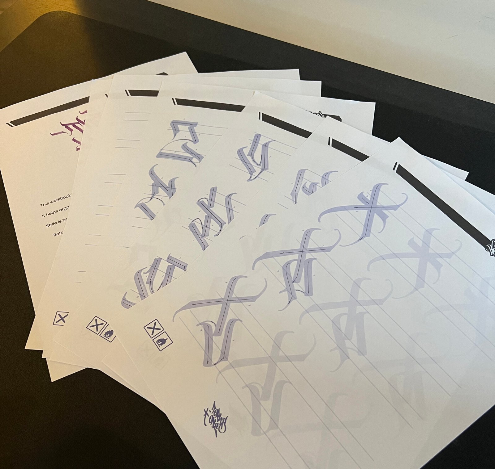 Inside this calligraffiti workbook, you’ll find a clear and structured set of practice sheets designed to build muscle memory and hand discipline.