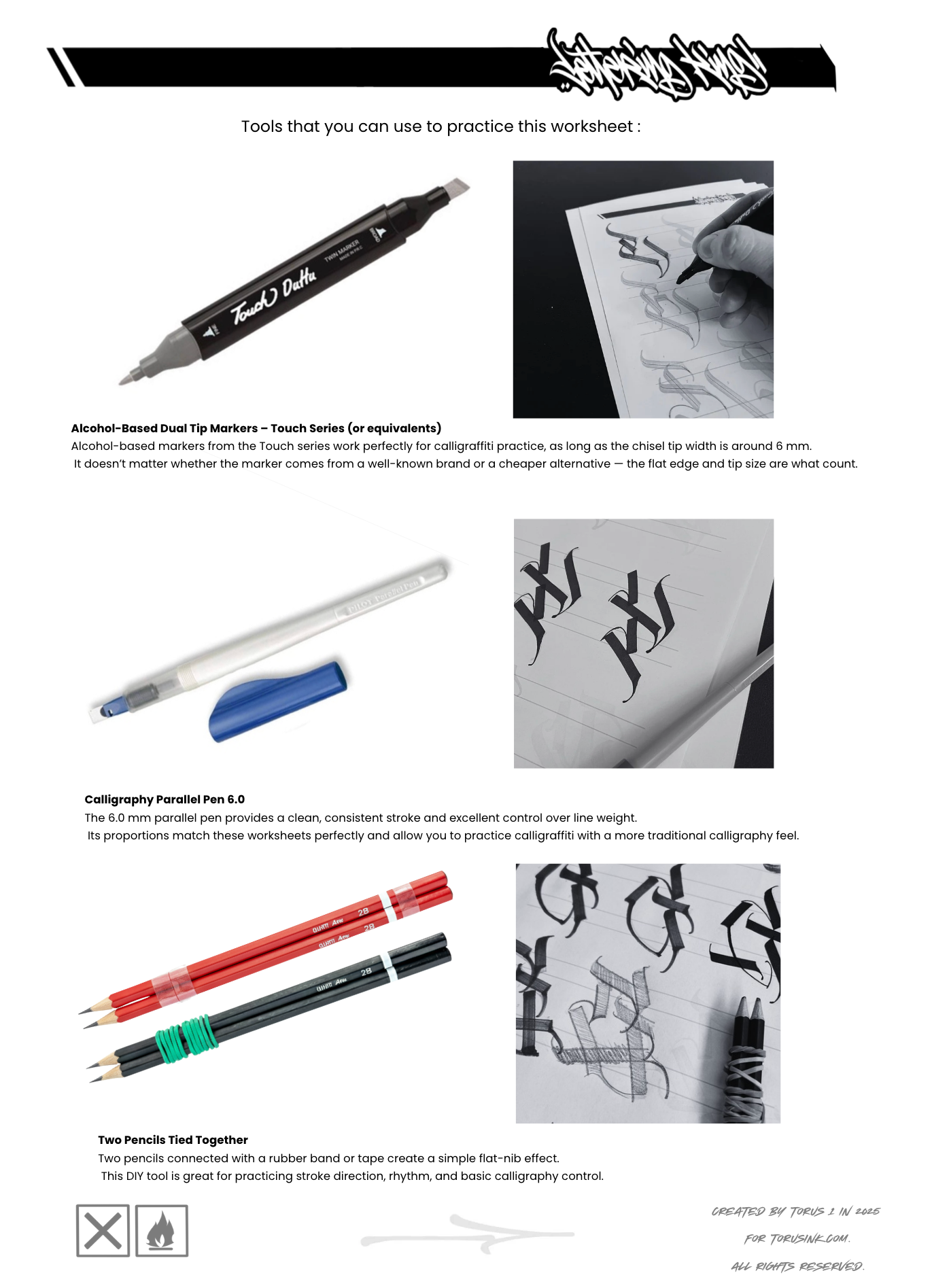 This calligraffiti practice PDF includes a clear overview of recommended tools.